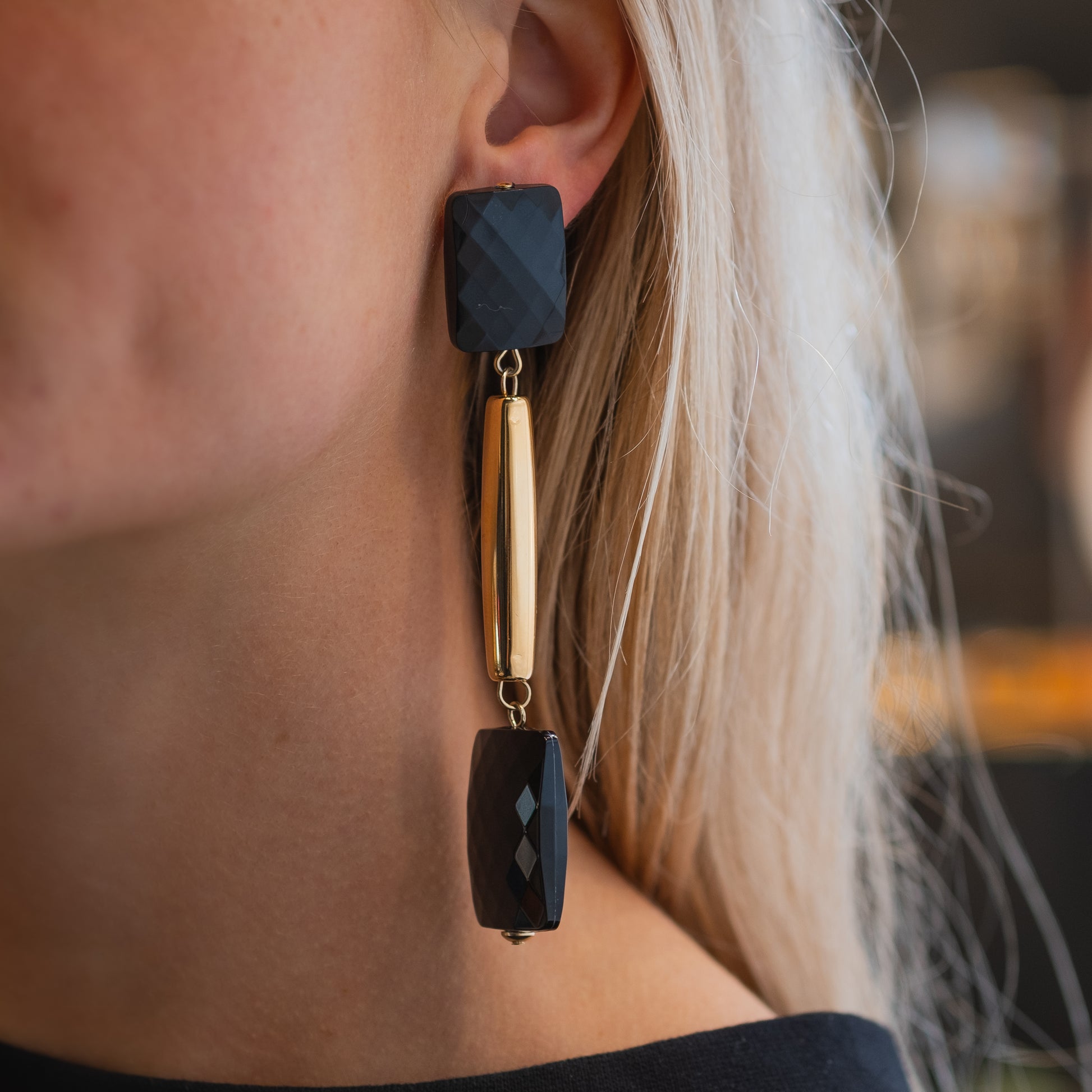 The Ariane earrings have a design with black rectangles and a gold bar in the middle. 🖤 All our jewelry is nickel-free and anti-allergic. 💫 These earrings are ideal for a sleek, modern look. 🌟