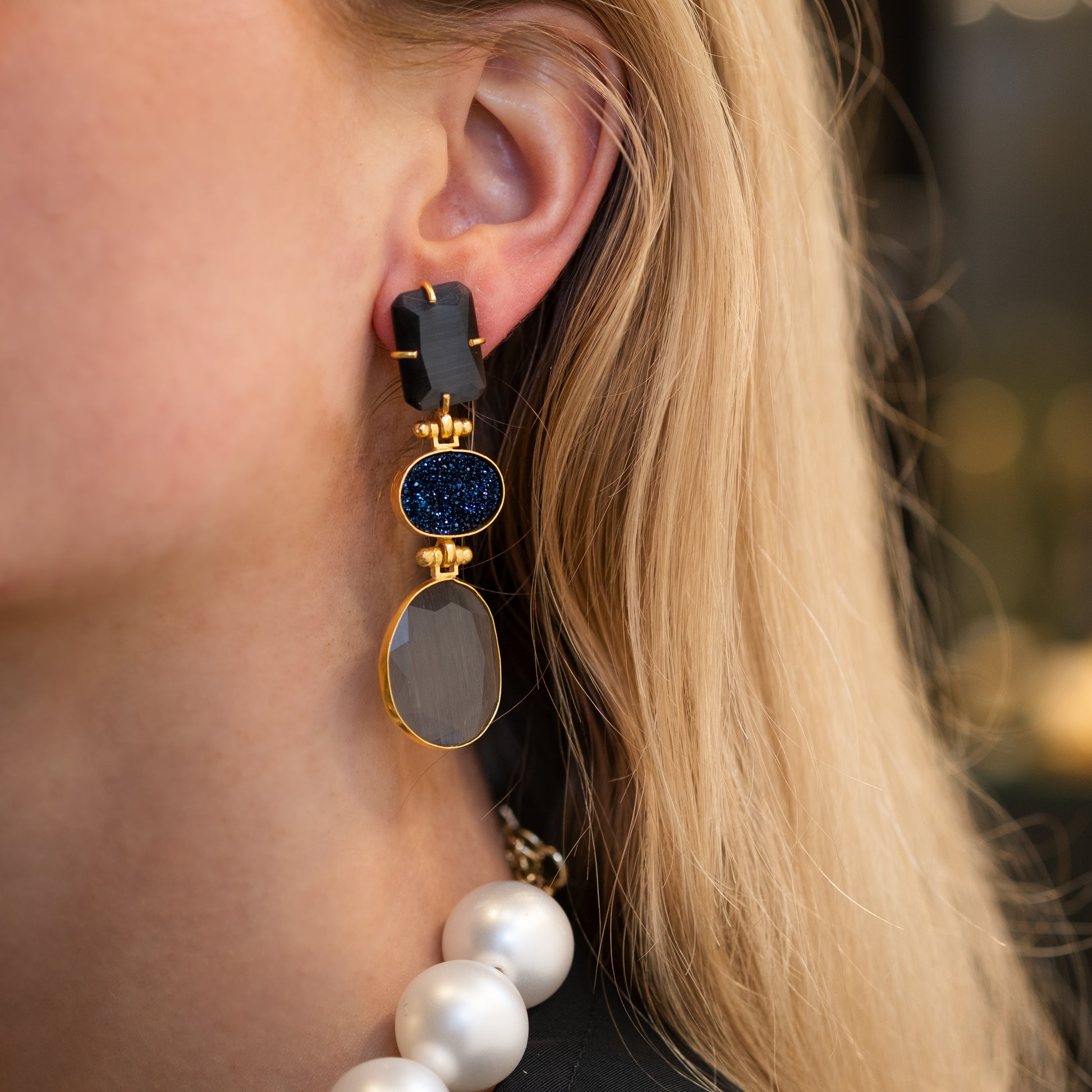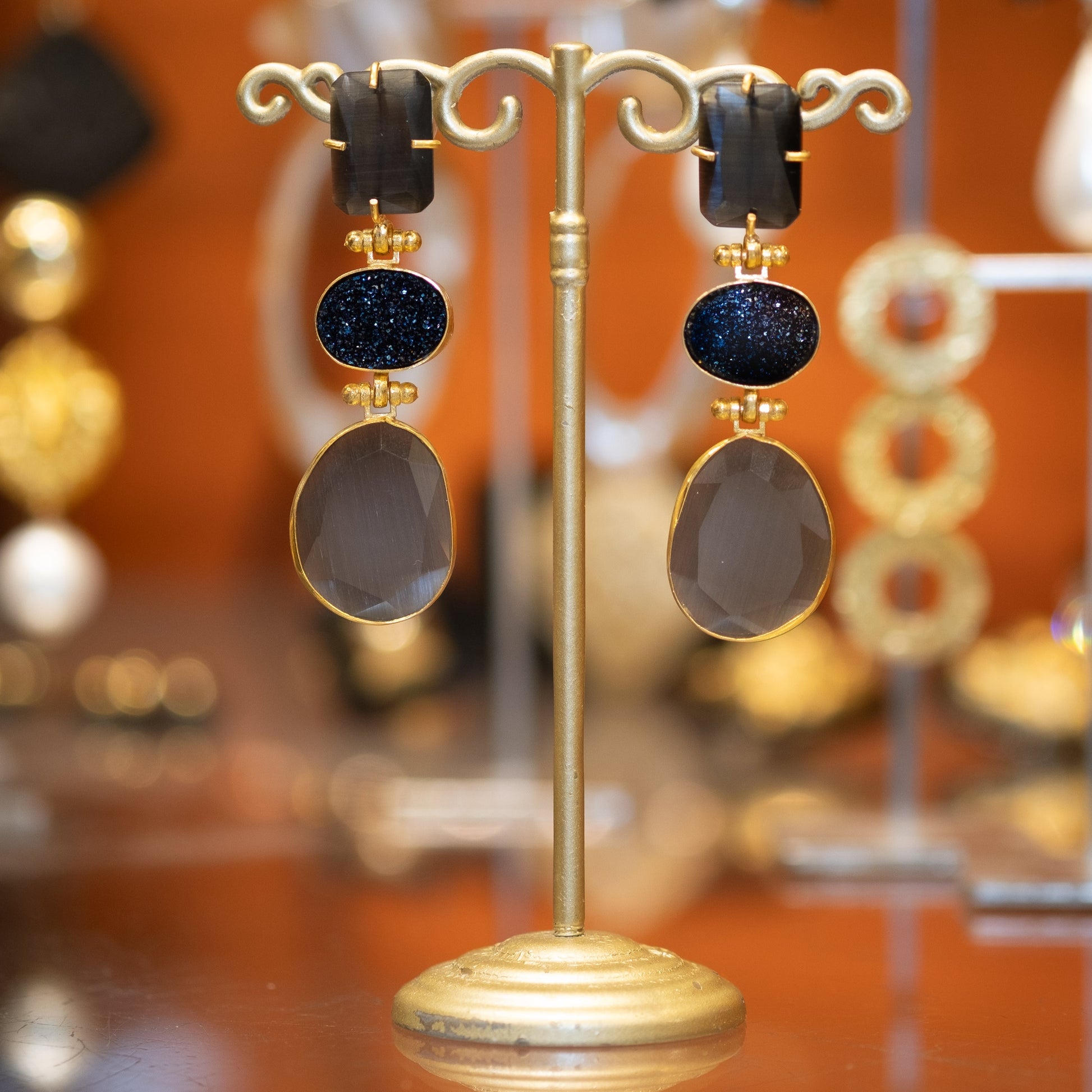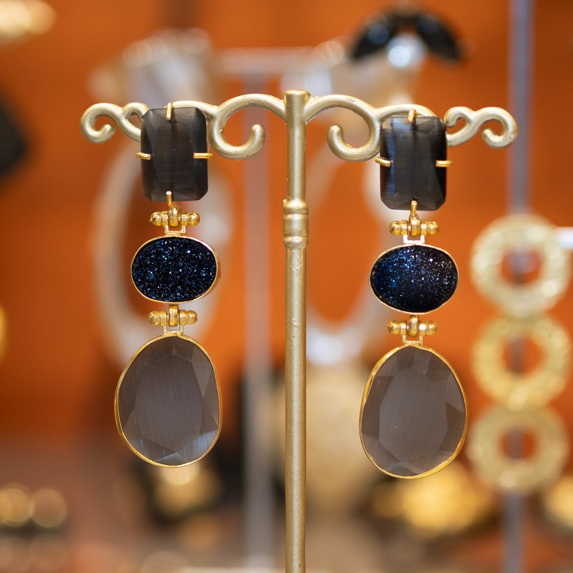An enchanting handmade earring, covered in dark blue and gray accents and subtly glittering, radiates a mystical elegance. All our jewelry is nickel-free and anti-allergic. 🧡 The Clémence earrings contain cat-eye stones, are lightweight, brass and gold-plated, with a stud earring. Crafted with meticulous care, each pair is a beautiful creation that frames the ears with a sparkling allure. 💋 The deep blue tones combined with the subtle glitter detail add a touch of glamor to these unique earrings. Whether they shine on special occasions or enhance everyday style, these handmade earrings are not just accessories; they are an expression of refinement and timeless class. 💌