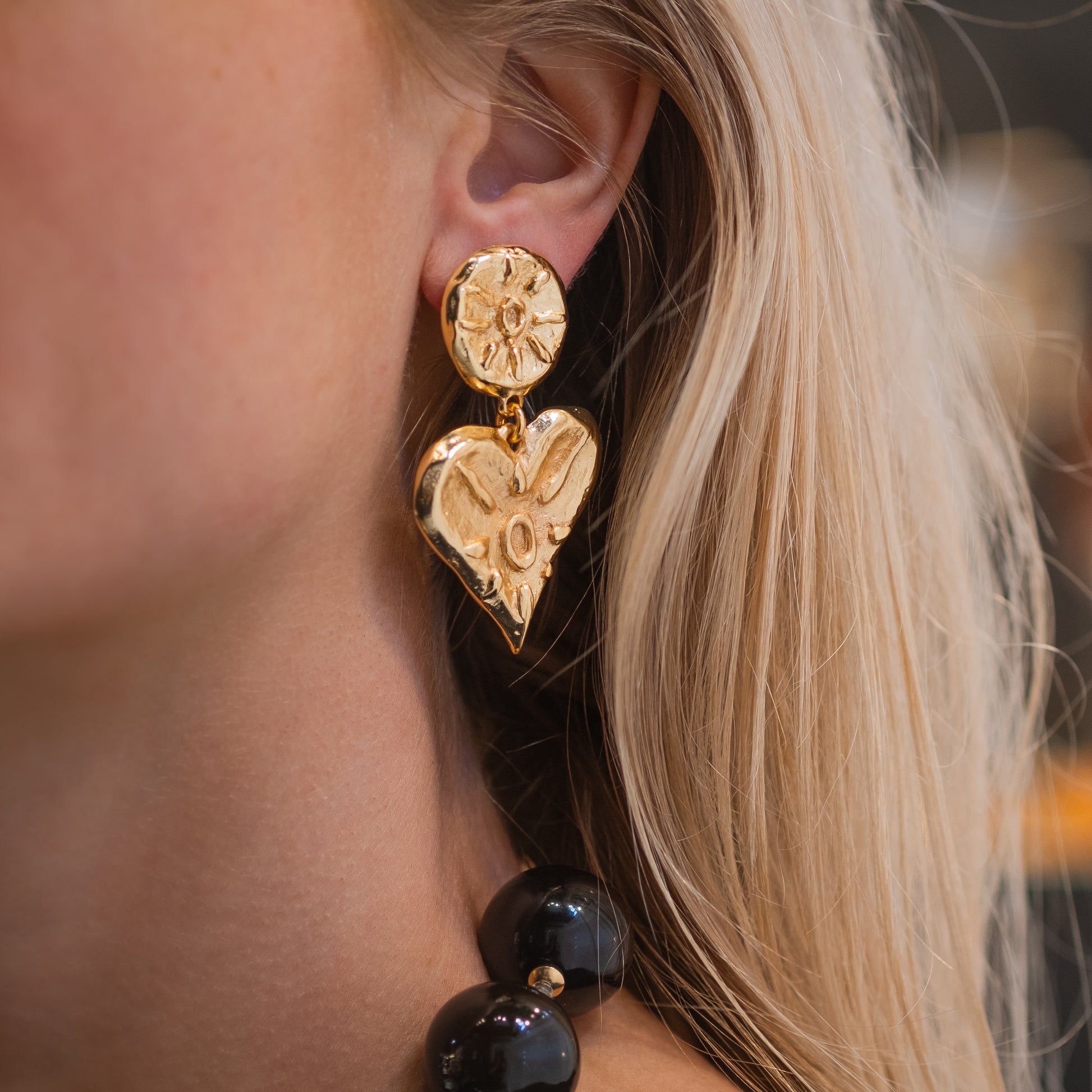 The Élodie earrings have a design with a round golden sun and a golden heart. 🌞 All our jewelry is nickel-free and anti-allergic. 💖 The vibrant colors and unique design make these earrings perfect for a bold look. 🌟