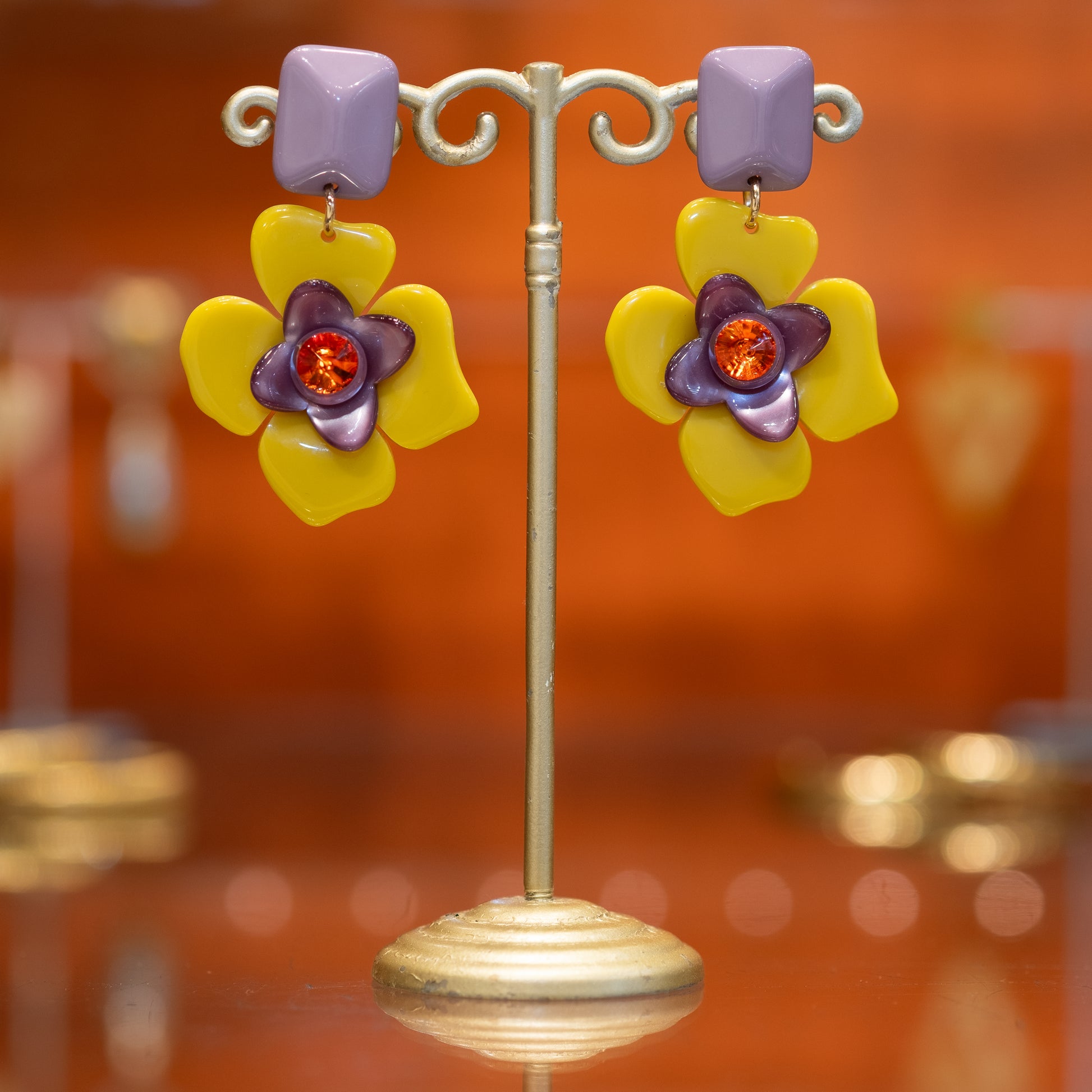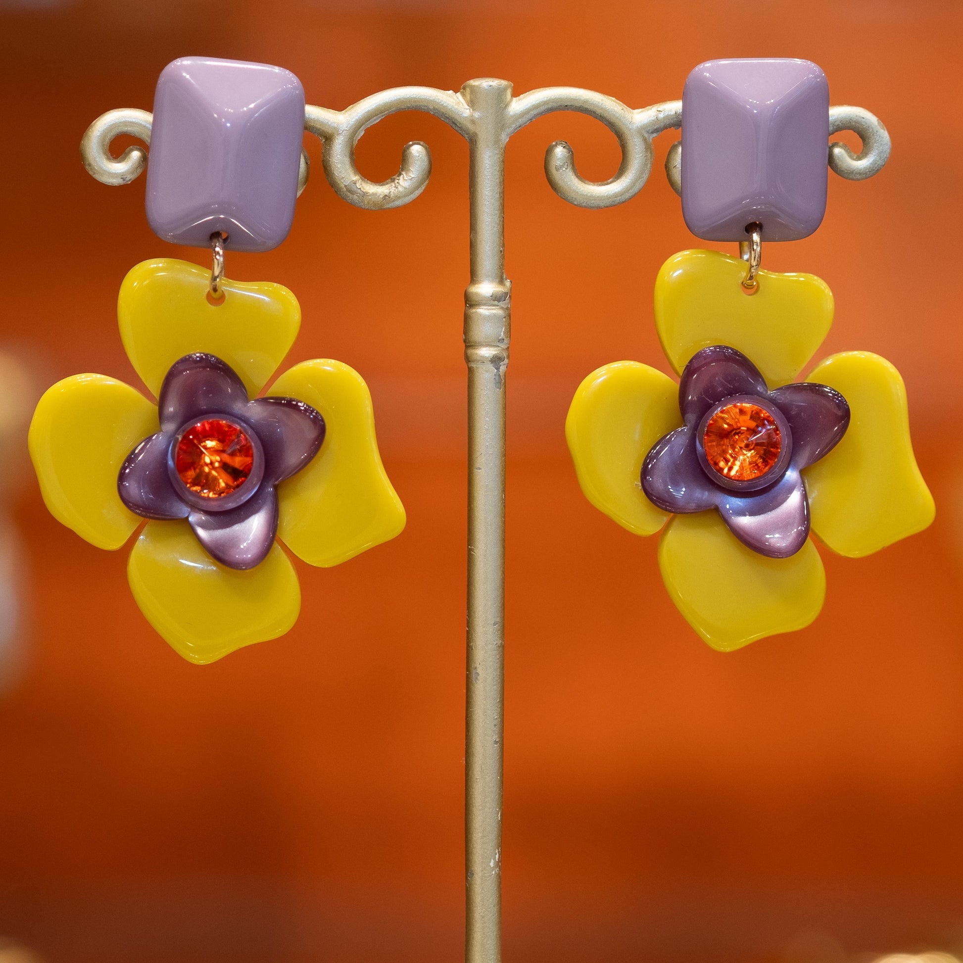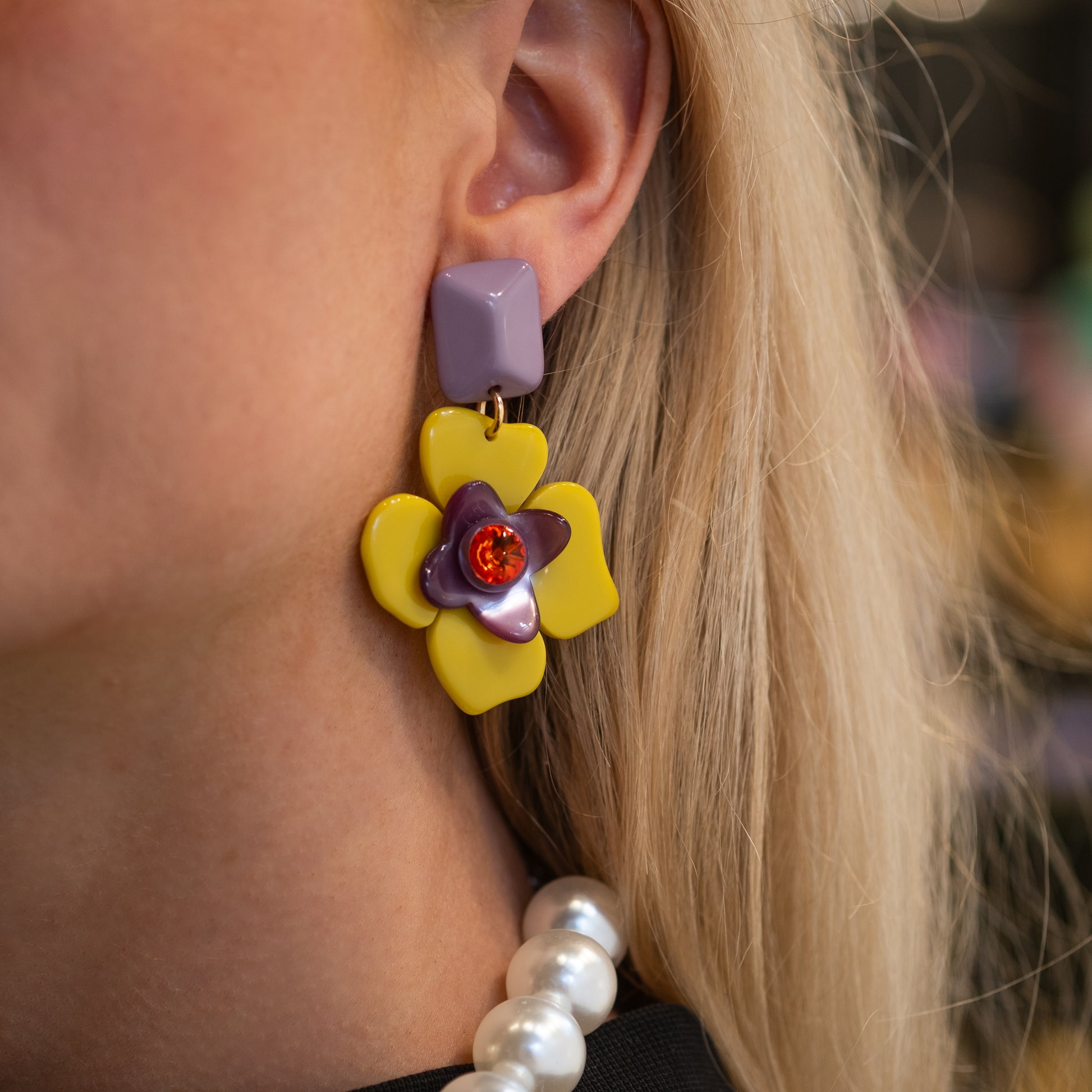 The Lucie earrings combine Italian resin in a flower shape with sparkling Swarovski crystals and an elegant resin top. 🧡 The enchanting color combination of purple, yellow and red makes for a vibrant and unique statement. 💋 All of our jewelry is nickel-free and anti-allergic. The Lucie earrings exude playfulness and sophistication, making them perfect for both special occasions and everyday wear. Their striking design and color palette make them a real eye-catcher. 💌