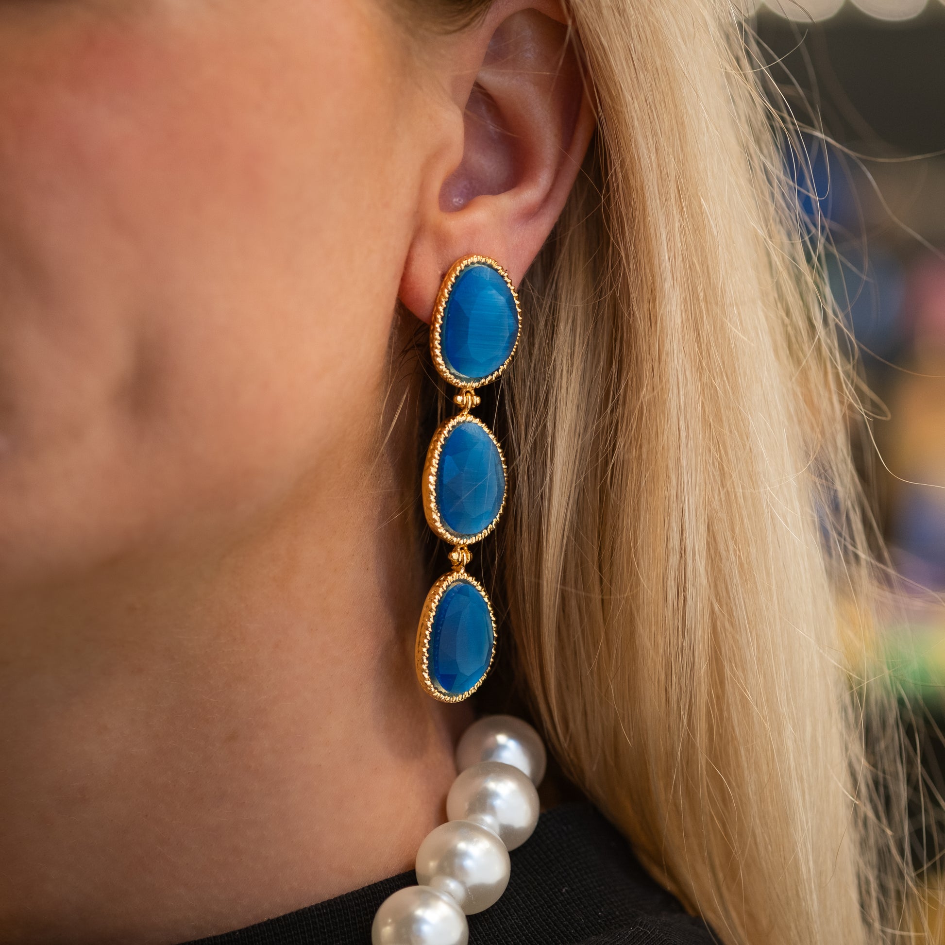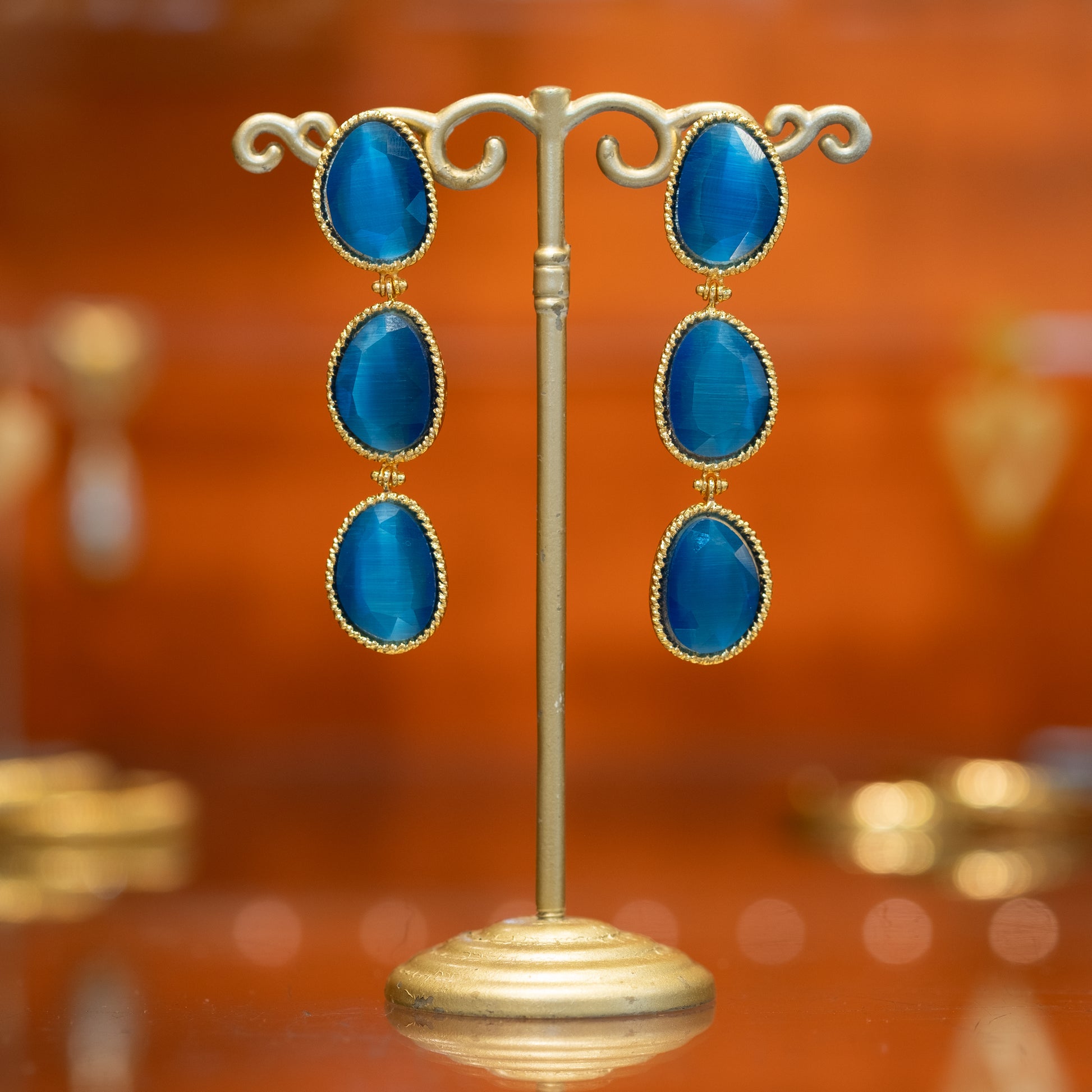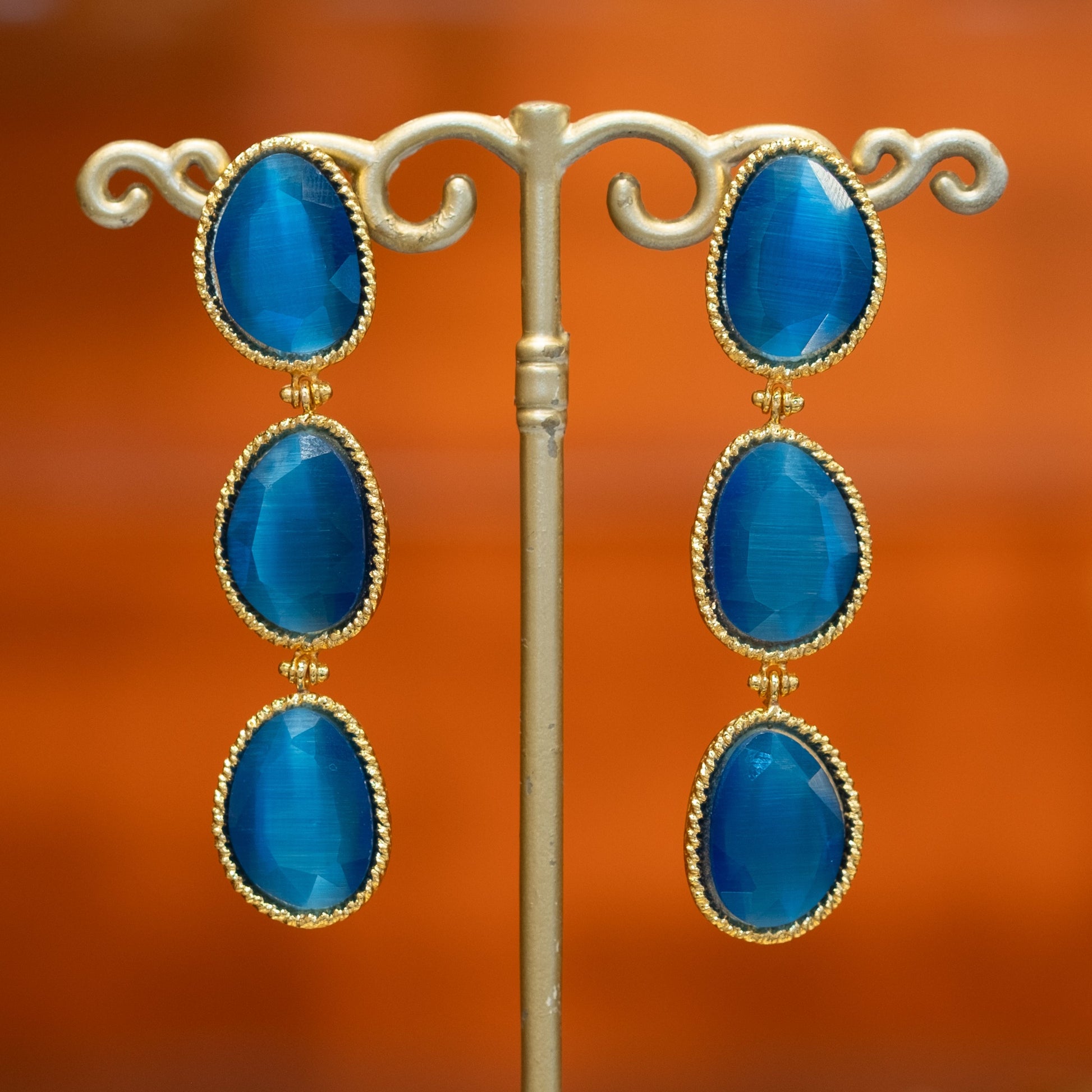 The Margaux earrings combine the classic elegance of gold-plated brass with the mysterious allure of blue cat's eye stones. 🧡 These earrings are nickel-free and anti-allergic, and the refined design exudes luxury and style. The rich gold-blue combination makes them a perfect accessory for any outfit, from casual chic to evening wear. 💋 Their timeless beauty ensures that they will become a beloved item in your jewelry collection. 💌